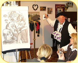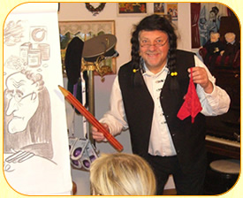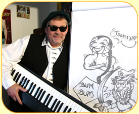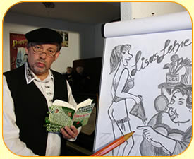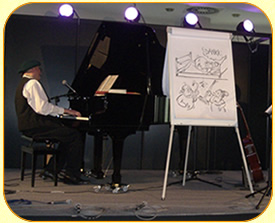 am Piano und frivole Karikaturen.